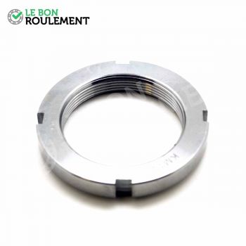 Tuerca de fijación con almena de acero inoxidable, de marca genérica especialmente utilizada sobre manguitos de fijación. Su roscado es M17X1, para un diámetro exterior de 28 mm y un espesor de 5 mm.