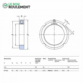Tuerca de fijación de precisión, de marca SKF. Su roscado es M75X2, para un diámetro exterior de 98 mm y un espesor de 14 mm. Más