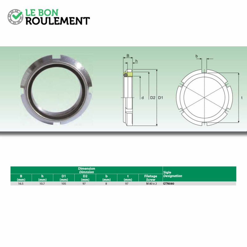 Tuerca autoblocante, de marca genérica. Su roscado es M80x2, para un diámetro exterior de 105 mm y un espesor de 16,5 mm. Más